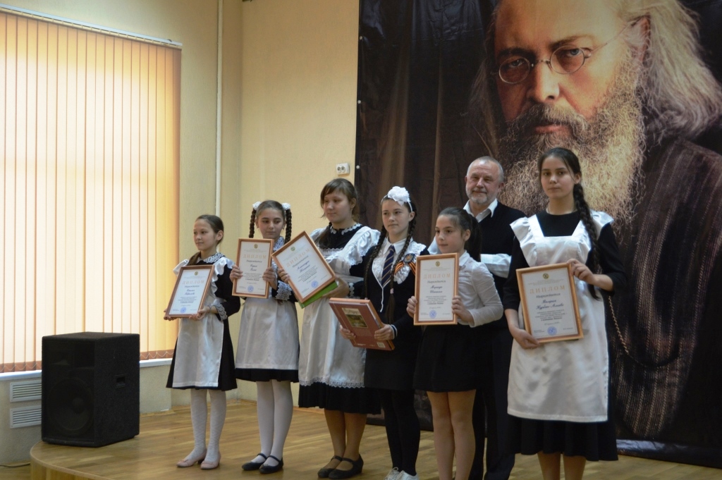Отец Димитрий вручил грамоты победителям номинации «Сочинение»: учащимся православной Свято-Никольской гимназии Наталье Овчинниковой, Ангелине Погосян, Александру Аргамакову, Екатерине Шевченко. Отдельную благодарность заслужила их наставник Клавдия Владимировна Ровенская.
