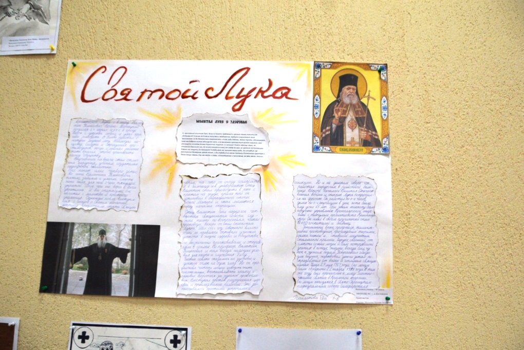 - Особые профессии – священник, учитель, врач, - сказала она. – Эти люди определяют культуру, духовность нации, страны. Наша профессия очень сложная. Чтобы стать хорошим врачом, нужно много учиться, совершенствоваться всю жизнь. Важно обладать глубоким сопереживанием, безупречной ответственностью, желанием помочь человеку. Старайтесь сделать все, что можете, тогда это будет оценено в полной мере. Относитесь ко всем так, как относился к  людям – великим Божьим созданиям - святой Лука.