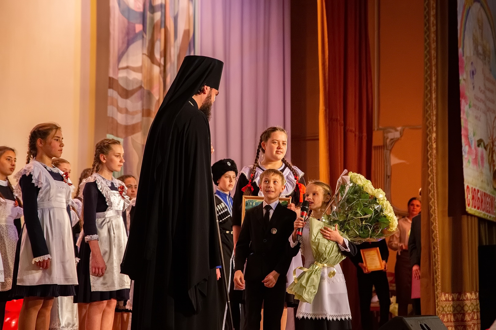 После молебна Архипастырь вручил медали «За труды на благо Пятигорской епархии» директору гимназии протоиерею Иоанну Знаменскому и сотрудникам православной школы: Ирине Рочевой и Татьяне Синявской, члену Попечительского совета Любови Сердюк. Архиерейские грамоты Владыка вручил как в храме, так и во время торжественного акта в санатории «Крепость».