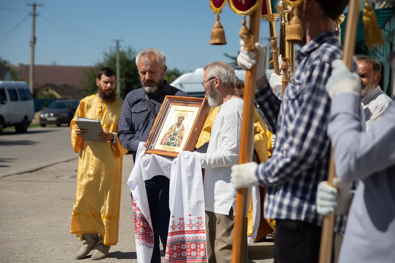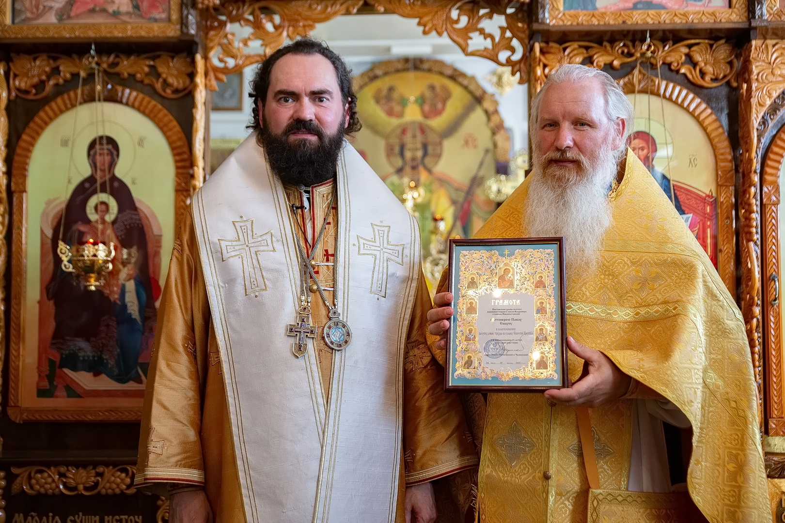 После литургии Владыка возглавил крестный ход, совершил славление равноапостольного князя Владимира и обратился к верующим с проповедью. Также архиепископ Феофилакт вручил Архиерейскую грамоту настоятелю храма протоиерею Павлу Сацуку.