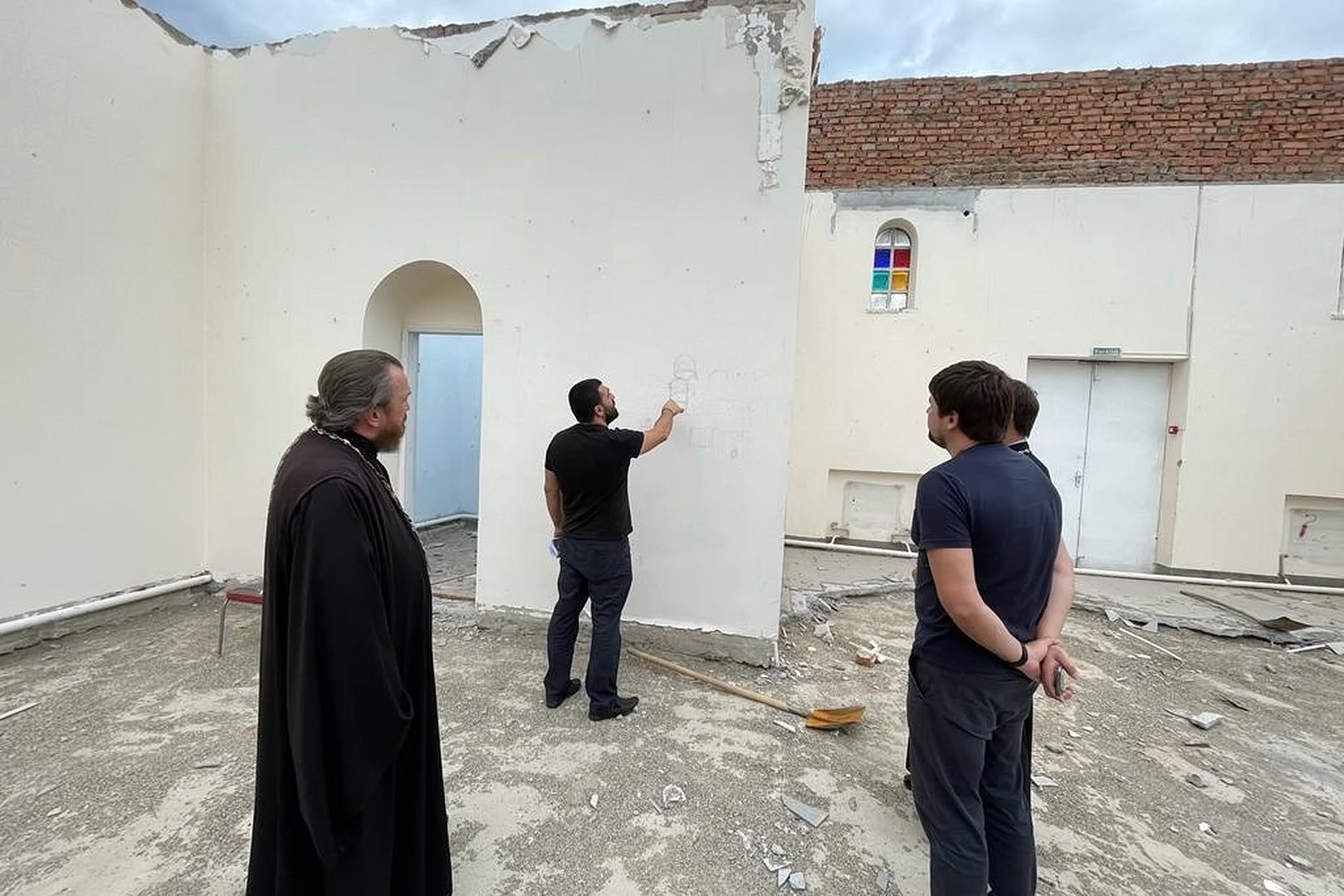 Руководитель епархиального отдела по строительству протоиерей Андрей Бондарчук, благочинный Ессентукского округа Пятигорской епархии протоиерей Стефан Фещенко, помощник благочинного по строительству иерей Михаил Журавлев, архитектор и древлехранитель епархии Олег Чечин обсудили с настоятелем храма святых и праведных Богоотец Иоакима и Анны протоиереем Андреем Филипповым и его помощником по строительству планы по реконструкции храма.