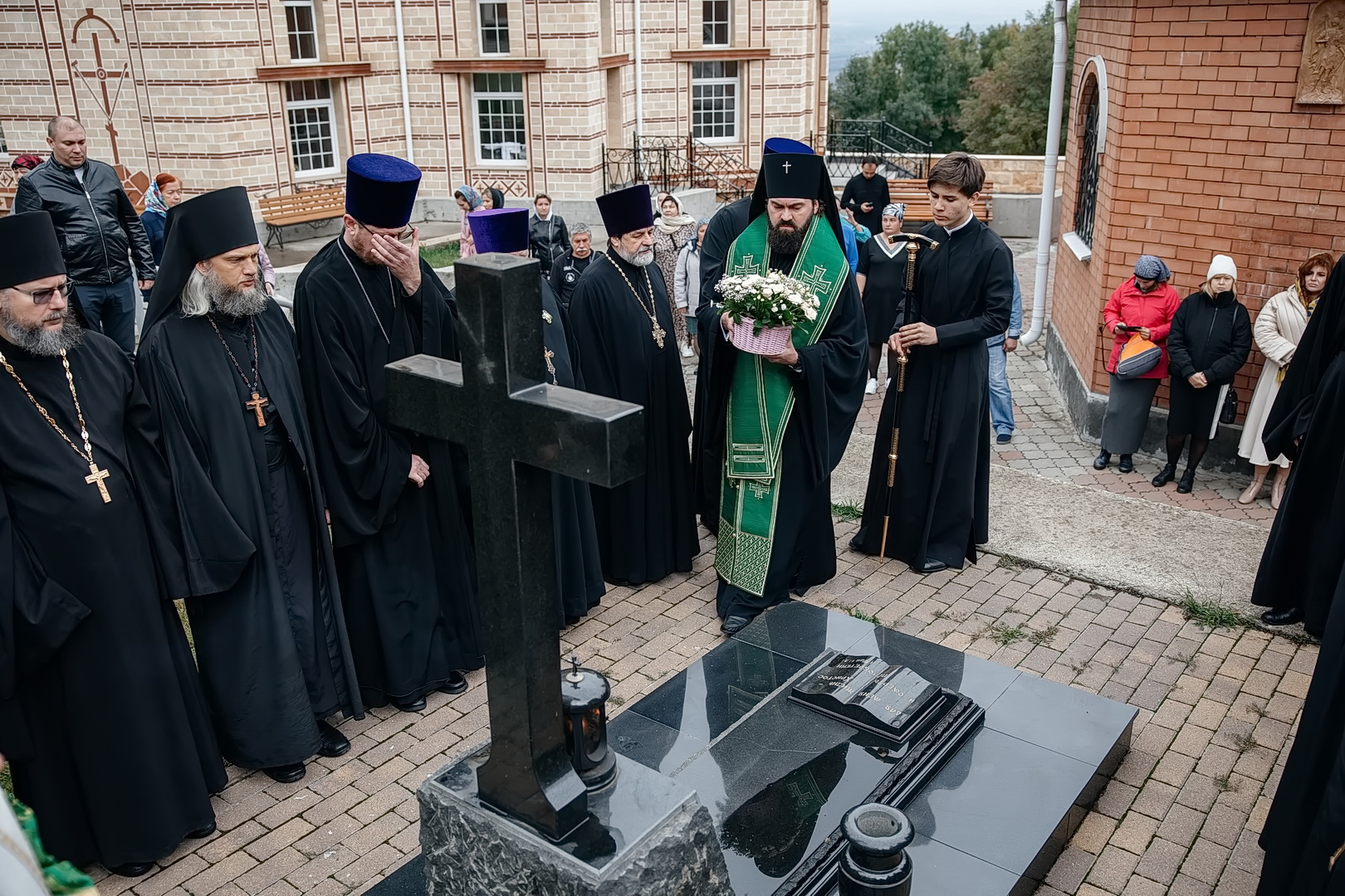 После литургии у могилы первого настоятеля возрождённой обители архимандрита Силуана (Хараима, +2011), Архипастырь с духовенством совершил заупокойную литию и возложил корзину цветов.