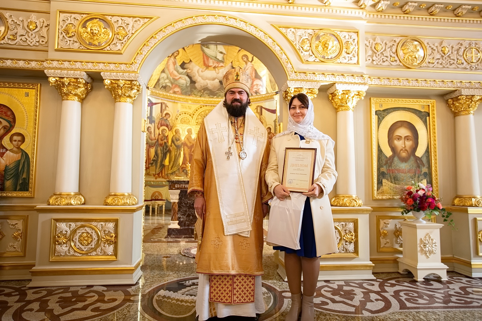 По окончании литургии архиепископ Феофилакт наградил победительниц конкурса «Фотолетопись Благословенного Кавказа». В нынешнем году жюри назвало лучшими работы только представительниц прекрасного пола. Трое лучших: Марина Жукова, Виктория Ендовицкая и Валентина Вдовина также получили из рук Архипастыря сертификаты епархиальной паломнической службы на участие в поездке в город Санкт-Петербург.