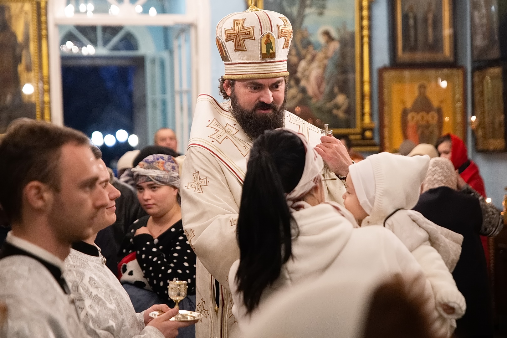 В этот же день архиепископ Феофилакт совершил Таинство Крещения младенца Матфея - сына настоятеля Иоанно-Богословского храма поселка Анджиевский иерея Максима Тарнакина. Владыка тепло поздравил семью священника, пожелал здравия и благоденствия новокрещённому.