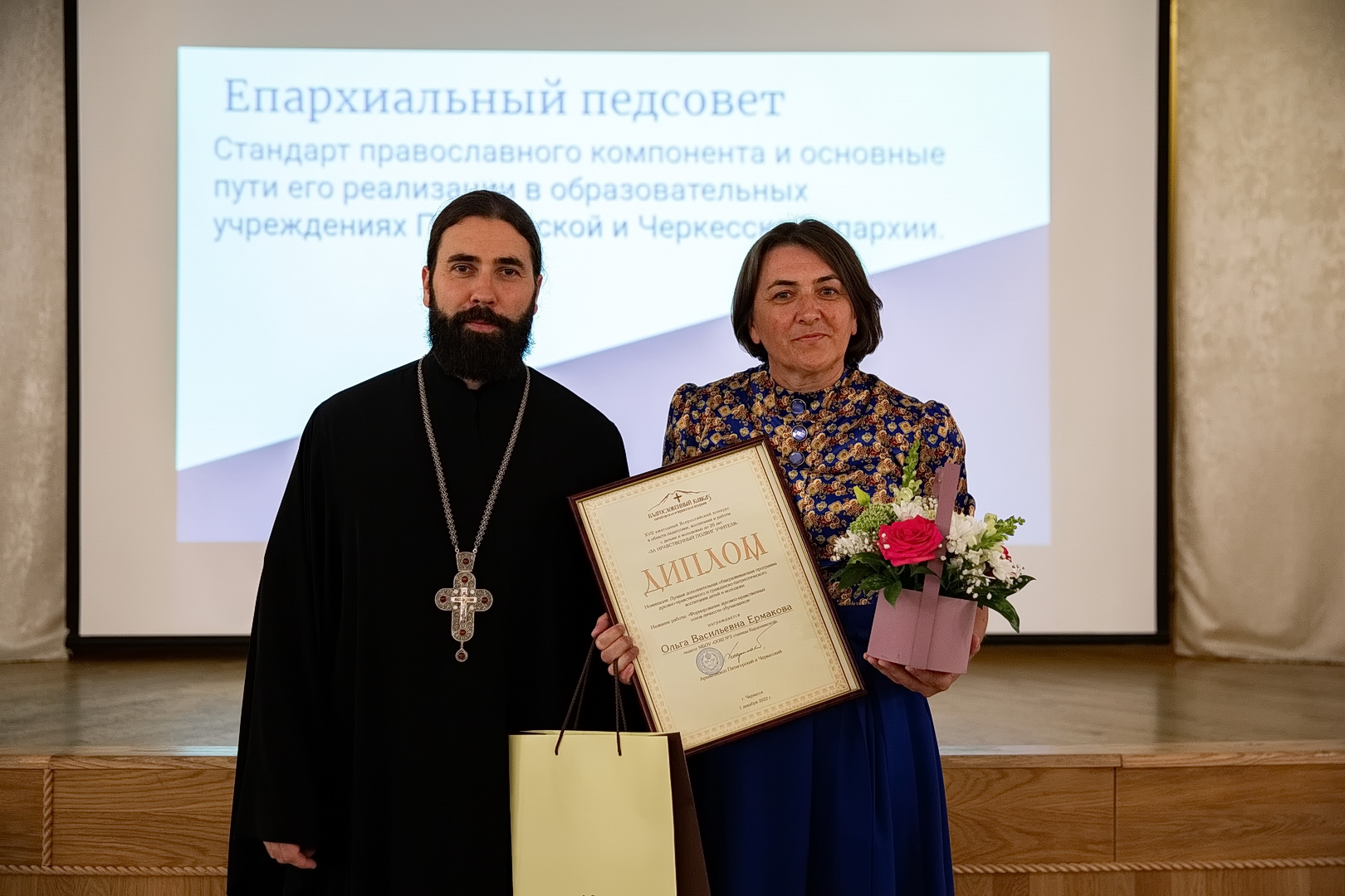Завершая собрание, отец Илия вручил диплом конкурса «За нравственный подвиг учителя» педагогу школы № 3 станицы Кардоникской, КЧР Ольге Ермаковой.