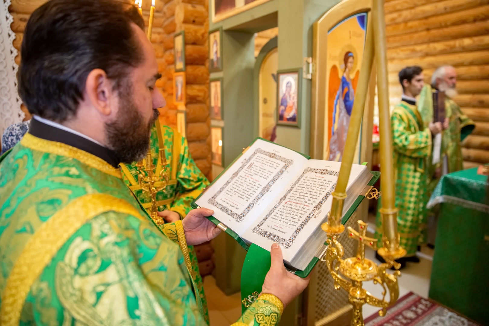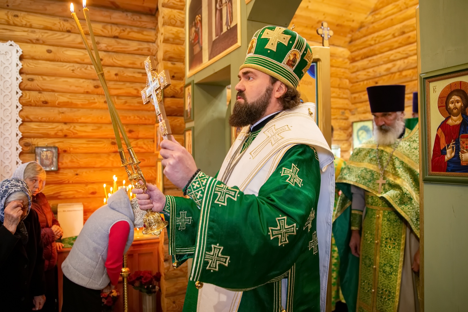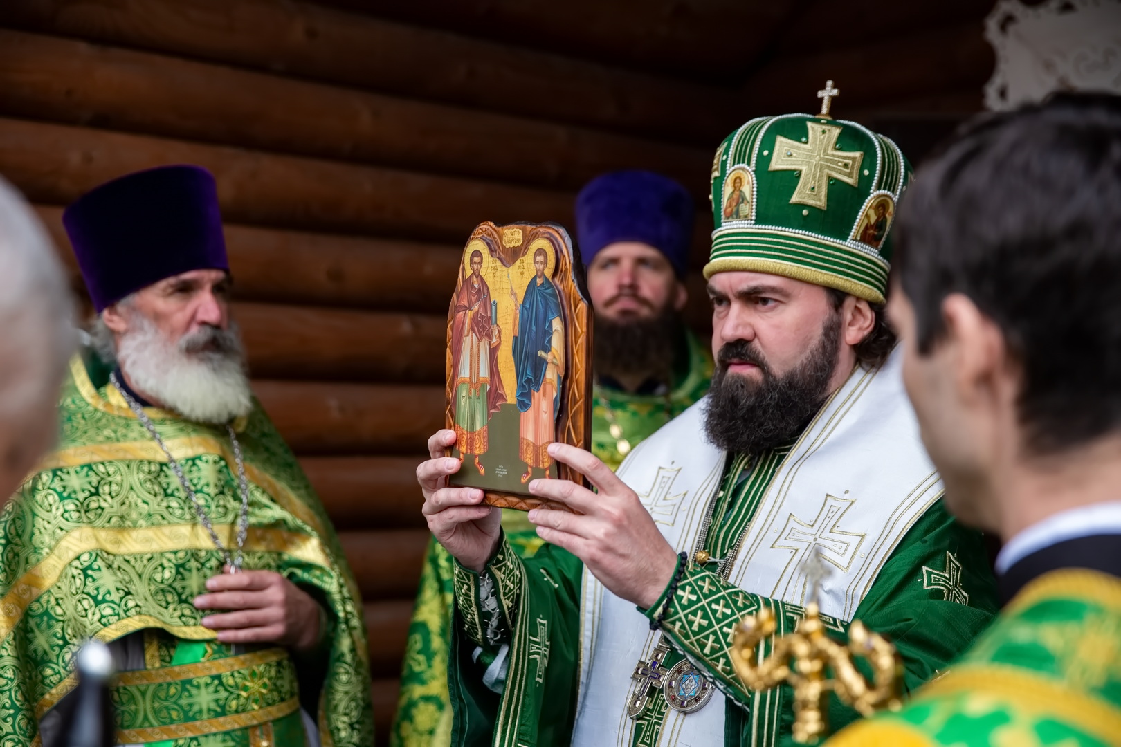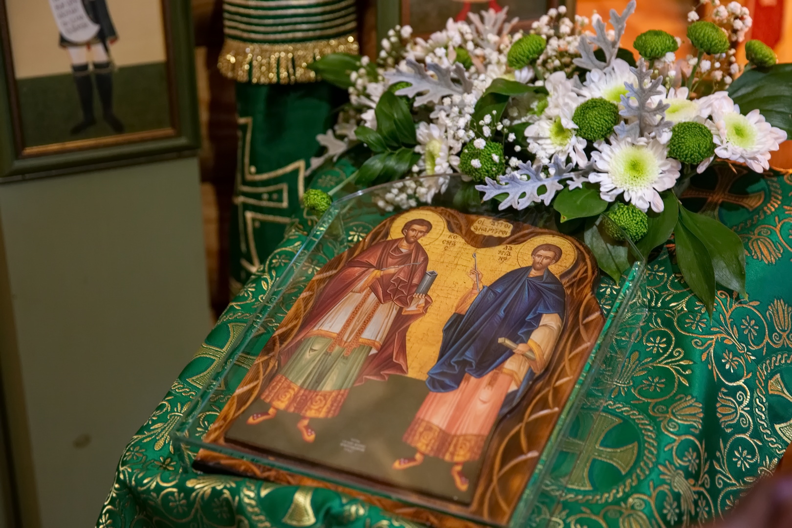 После литургии Владыка возглавил крестный ход, совершил славление небесных покровителей храма и обратился к верующим с проповедью.