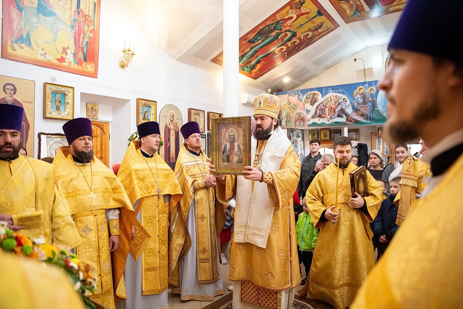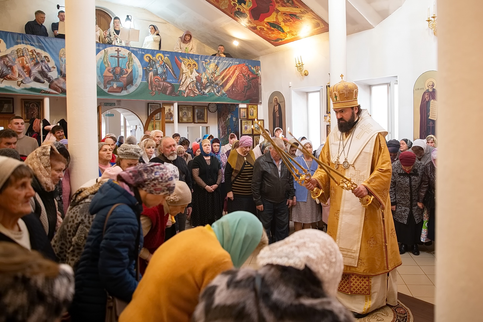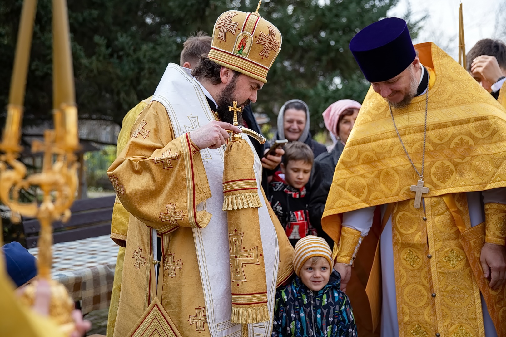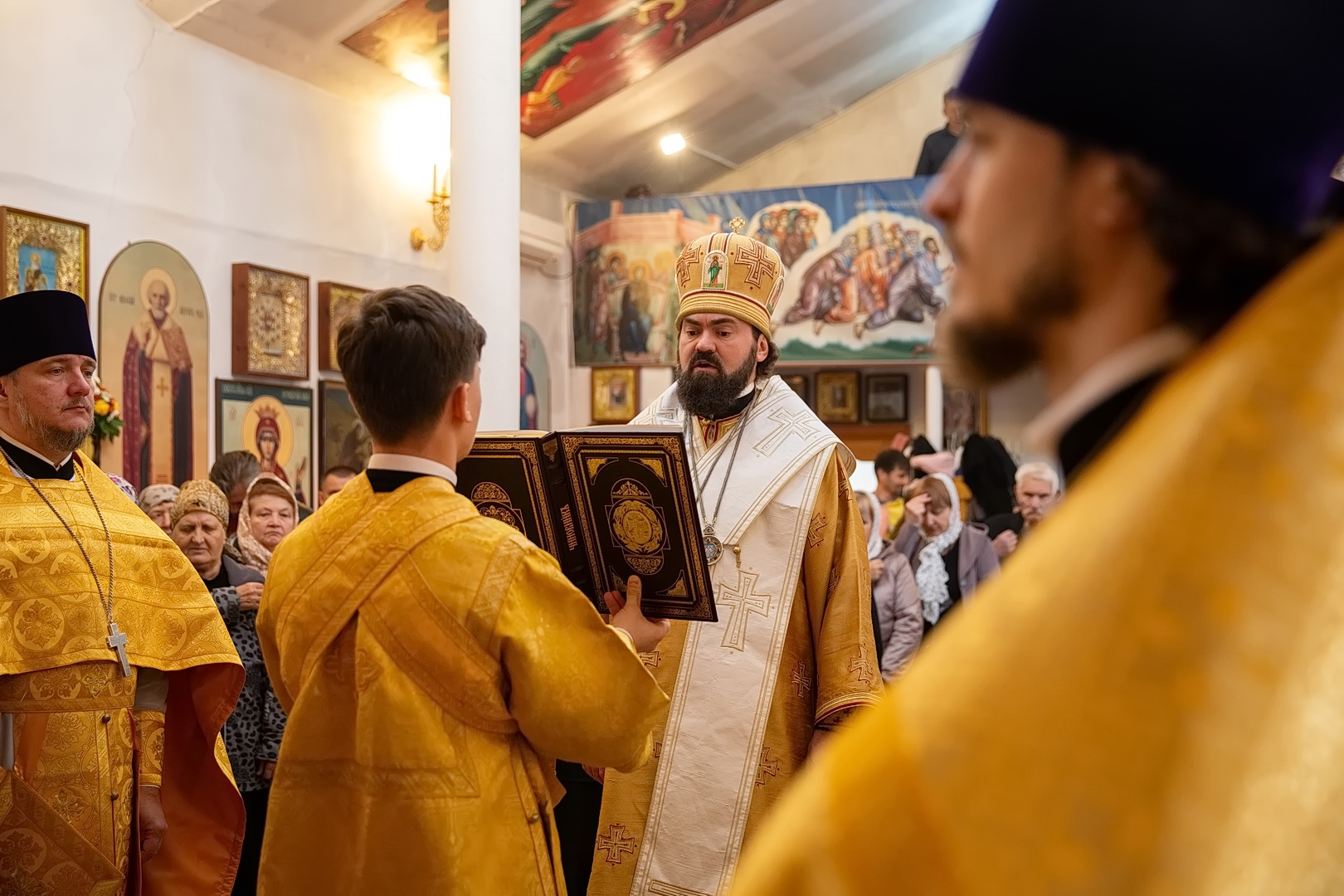 После литургии Владыка возглавил крестный ход, вручил благодарственное письмо благотворителю храма и обратился к верующим с проповедью. Затем с поздравлением перед участниками праздника выступили воспитанники приходской воскресной школы.