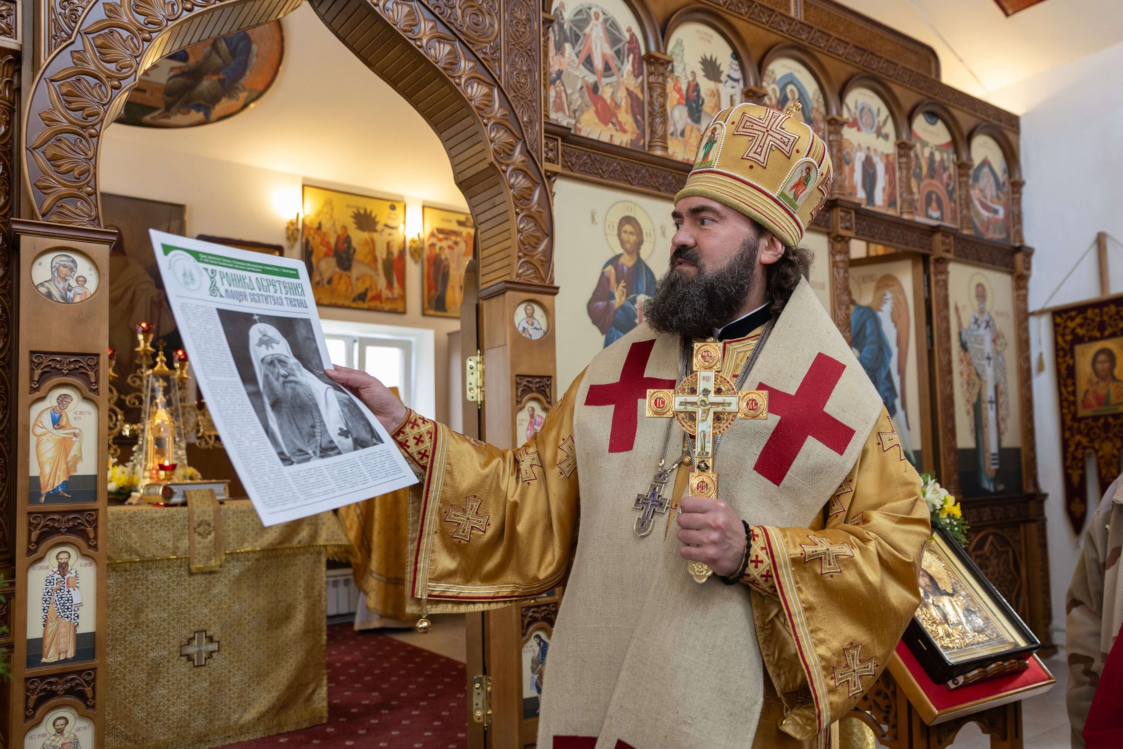 После литургии Владыка возглавил крестный ход, совершил славление небесного покровителя храма и обратился к верующим с проповедью. Также архиепископ Феофилакт вручил Архиерейскую грамоту прихожанке храма Ирине Смолоноговой и презентовал приходской листок, посвященный истории обретения честных мощей святителя Тихона.