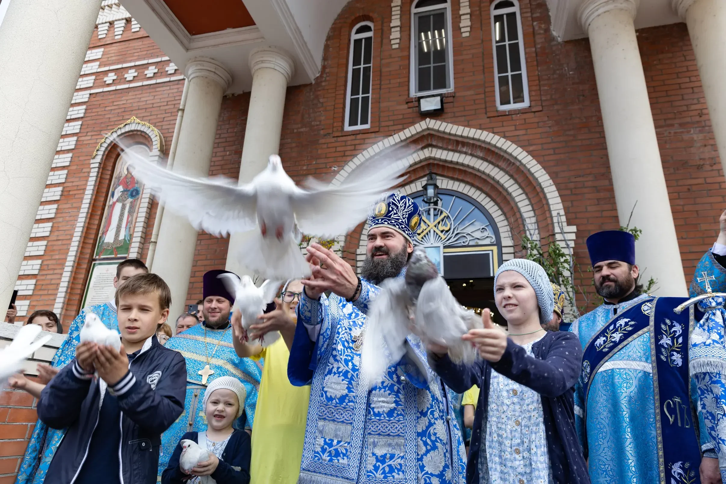 После литургии Владыка возглавил крестный ход, совершил славление Пресвятой Богородицы и, по традиции, вместе с детьми выпустил в небо белых голубей.